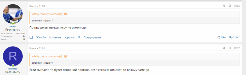 Замена уже выложенных прогнозов НЕ РАЗРЕШАЕТСЯ. Исключение - отмена матча, перенос полного матча на другой игровой день (если в линии остались несыгранные матчи).