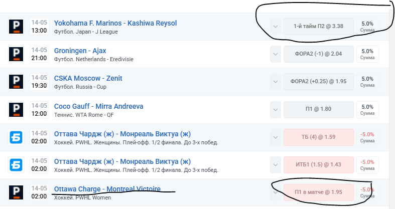 У моего оппонента ставка в минус рассчиталась, хотя это заход Ottawa Charge - Montreal Victoire - тут п1 же в матче зашло.